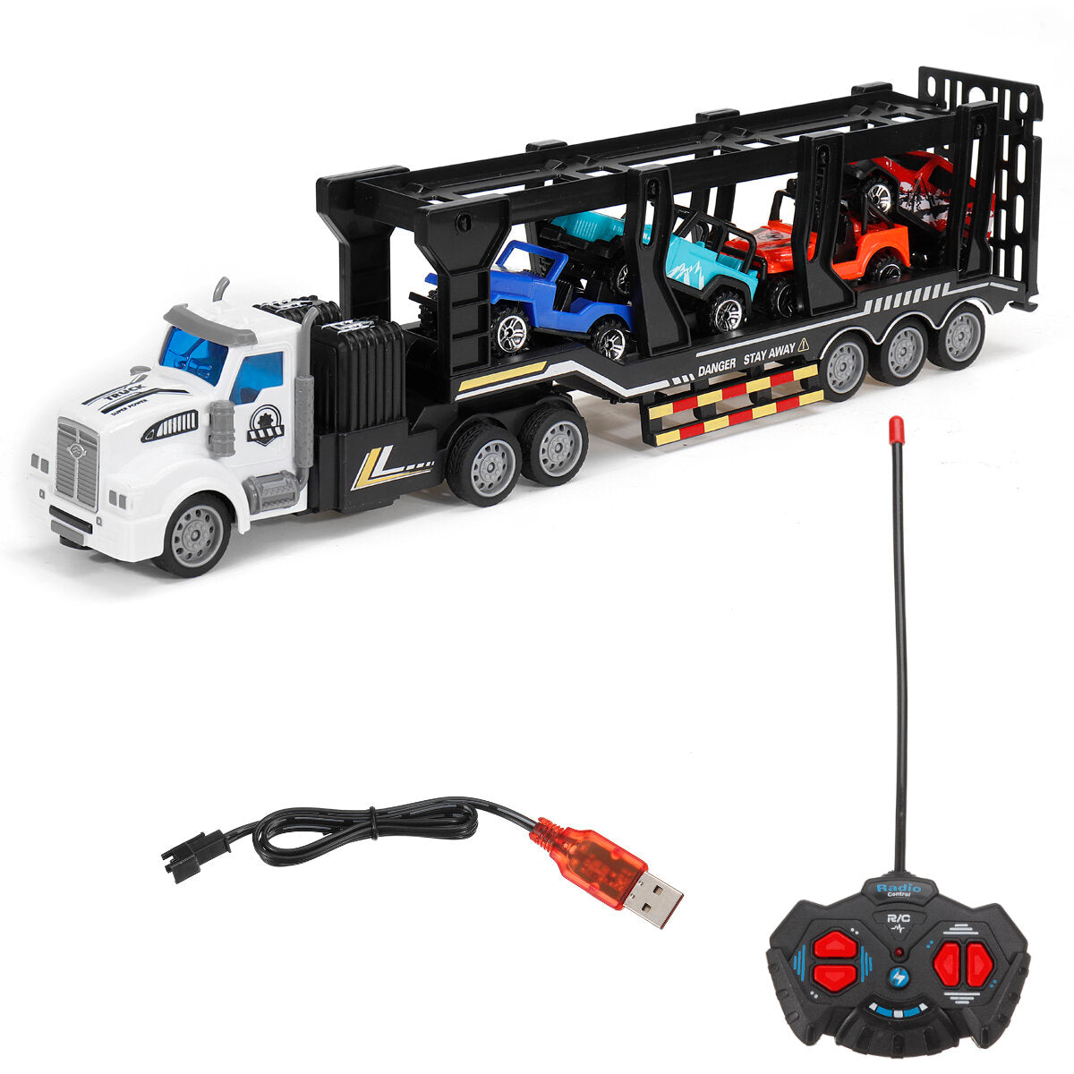 QH-200-7 1/48 27MHZ 4CH RC Car Truck Kid Toy Remote Control Double-layer Transporter with 4 Small Vehicles Boys Gift