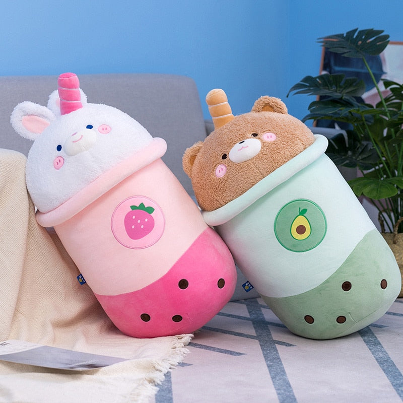 Adorable Cartoon Animals Boba Tea Plush Toy Stuffed Avocado Brown Bear Pink Strawberry Bunny Milk Tea Cup Toy Big Hug Pillow Toy
